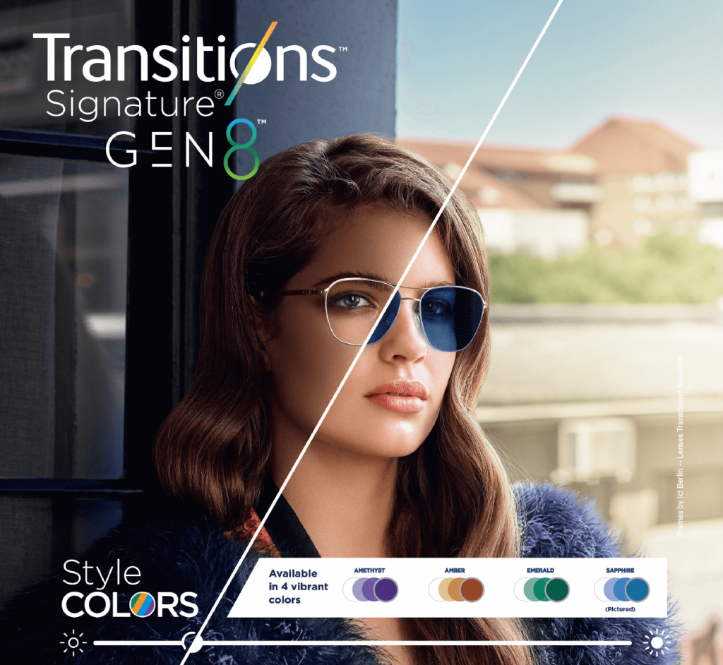 Transitions® Signature GEN8 blocks 100% of UV Rays and offers protection against harmful blue light. Outdoors, Transitions® Signature GEN8 lenses go darker than ever, giving you the highest level of protection from glare, then quickly return to clear without affecting your visual comfort.